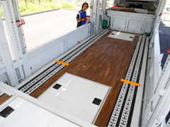 Based upon its experiences and know-how, TransWeb succeeded in development of a new transporter that carries four SUVs with high roof at one time. The secret behind superb loading capacity is to rise the roof as high as legally possible plus a unique front floor that goes up and down approximately 50cm. The power rear gate now allows payload up to 2.5t, approximately one-ton more than the previous system. It is capable of lifting up and down almost all the passenger cars commercially available in the market.
